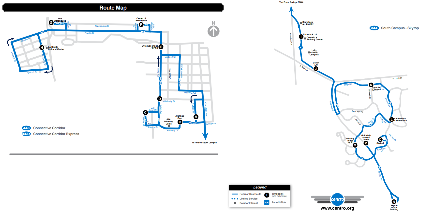 | Route | College Place | Barnes Center at The Arch | Henry St & Van Buren St | Irving Ave & University Pl | Syracuse Stage - Community Folk Art Center | E Washington St & Almond St | The Warehouse |