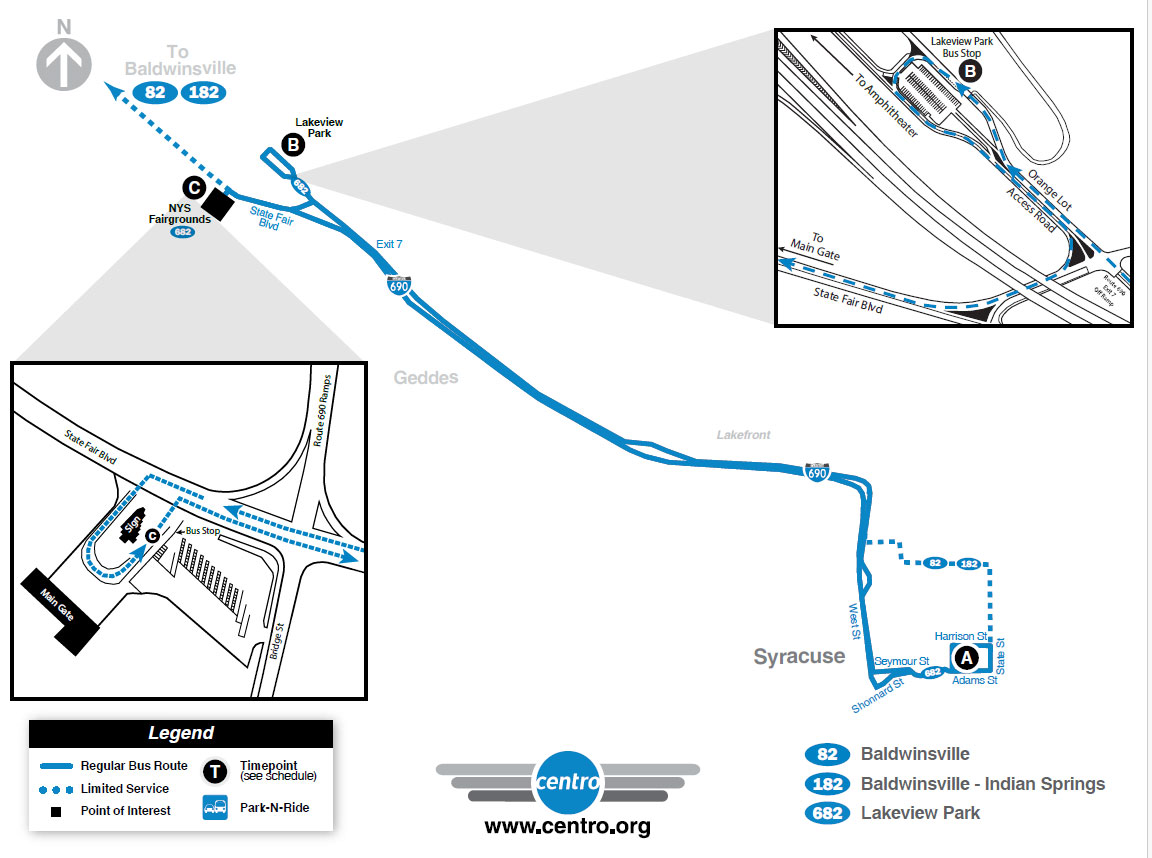| Route | C20 | S State St & Madison St | S Franklin St & W Washington St | New York State Fair (Across from Gate 2) | State Fair Blvd & Pleasant Beach Rd | Dwight Pk Circle & Dwight Pk Dr | State Fair Blvd & Jones Rd | Delwood Dr & Village Blvd S | River Mall | Oswego Rd & Genesee St | Brundage Rd & Sixty Rd |