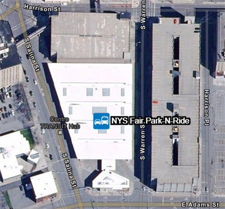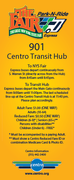 The Park-N-Ride Express departs continuously to the NYS Fair - Main Gate from S. Warren St (directly across the street from the Centro Transit Hub) beginning at 8:45 am and continuing until 8:45 pm.