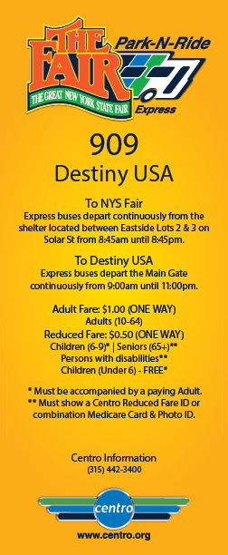 The Park-N-Ride Express departs continuously to the NYS Fair - Main Gate from the Destiny USA shelter located between Eastside Lots 2 & 3 on Solar St beginning at 8:45 am and continuing until 8:45 pm.
