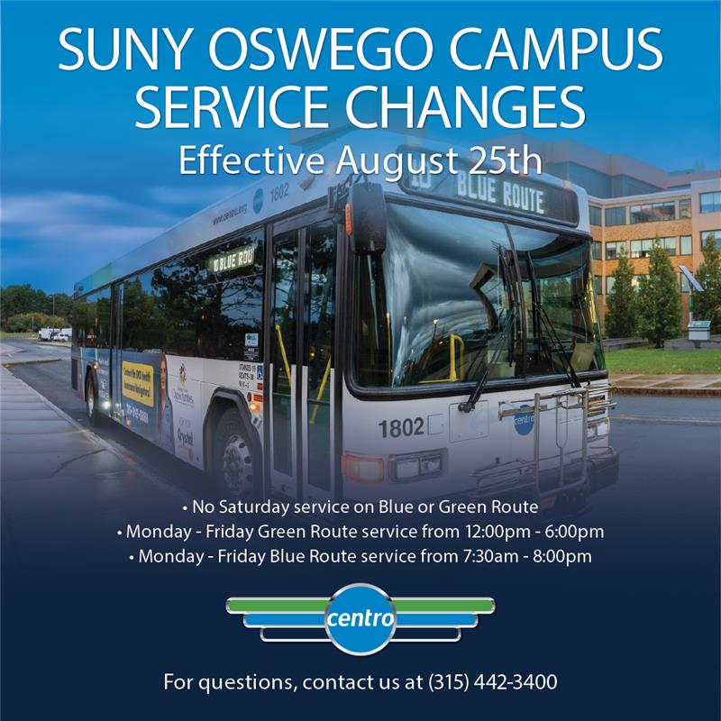 Centro provides FREE* transportation across campus to SUNY Oswego students who show their valid SUNY Oswego ID.