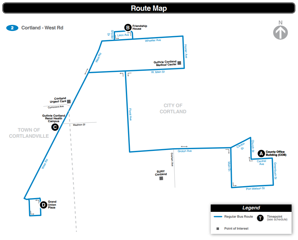 | Route | Cortland County Office Building | Friendship House Apartments | West Rd & Madison St | Grand Union Plaza |