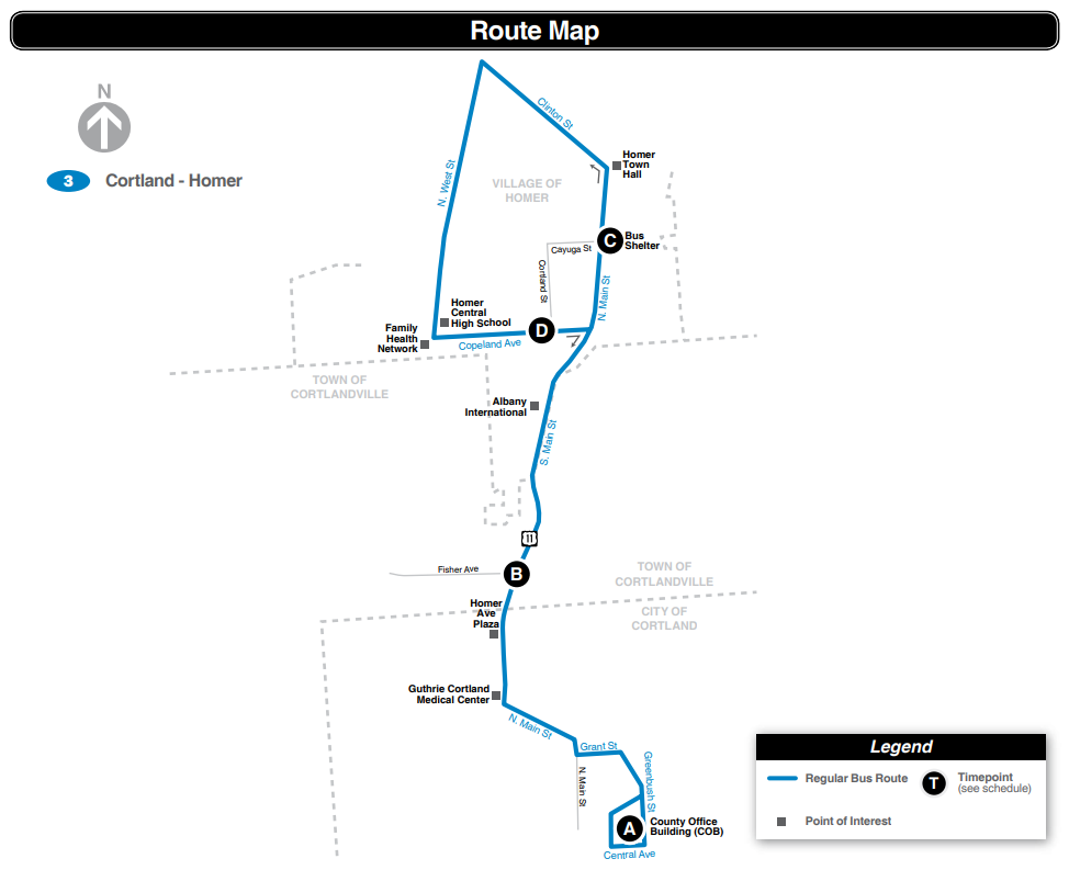 | Route | Cortland County Office Building | Route 11 & Fisher Ave | S Main St & Cayuga St | Copeland Ave & Cortland St |
