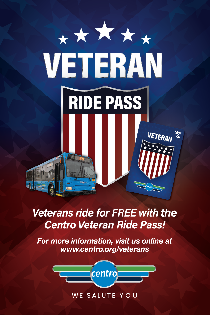 Veterans who use Centro’s bus service are encouraged to apply for a Veteran Ride Pass. Veteran Ride Passes are accepted on any of Centro’s regular fixed-route buses. The Veteran Ride Pass allows Veterans to ride the bus for FREE – any day of the week and any time of the day.